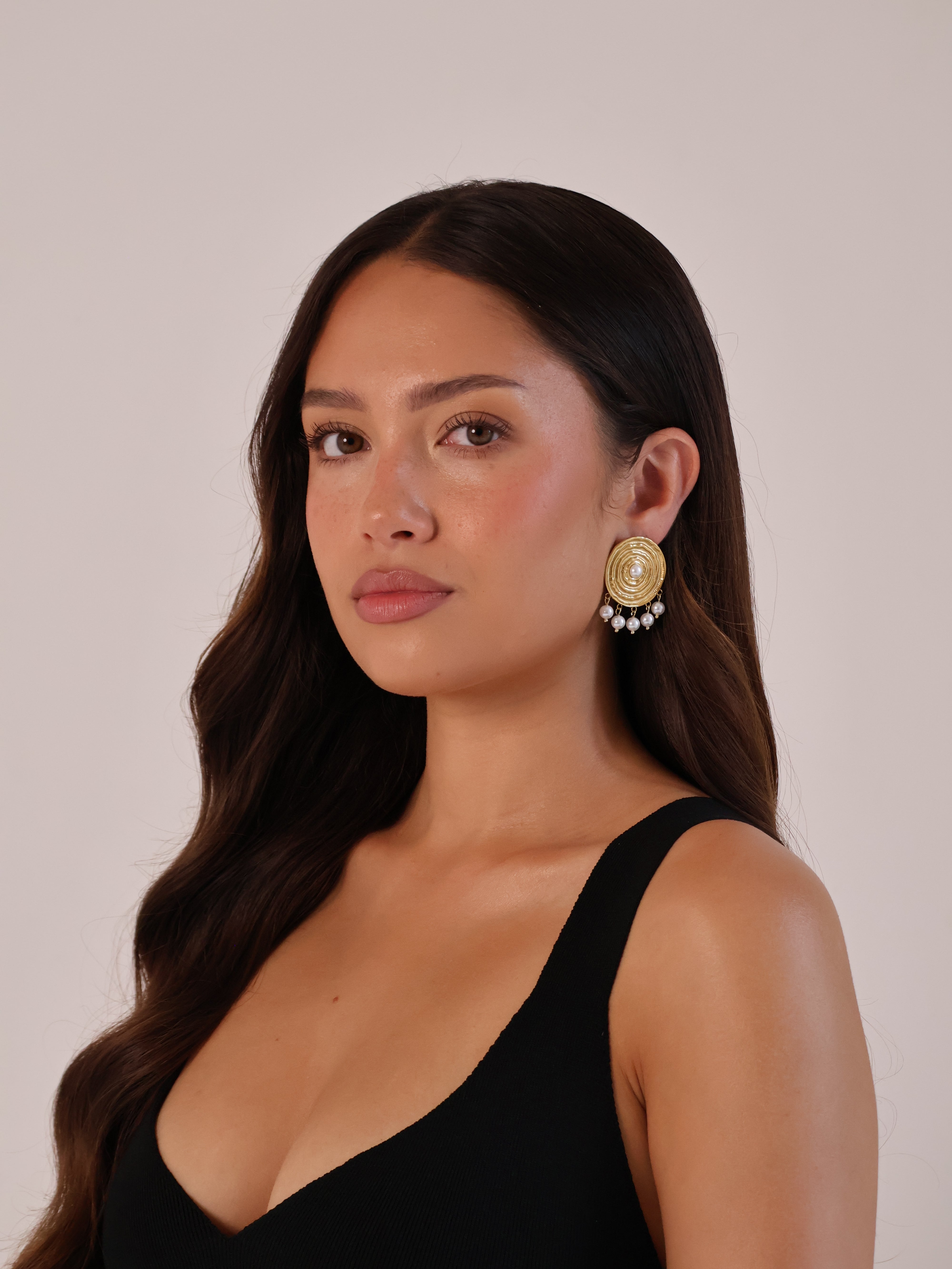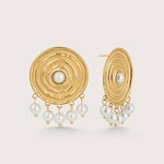 The circular pearl drop earrings are the perfect pair of earrings to take on holiday. Day time or night, they make a statement.