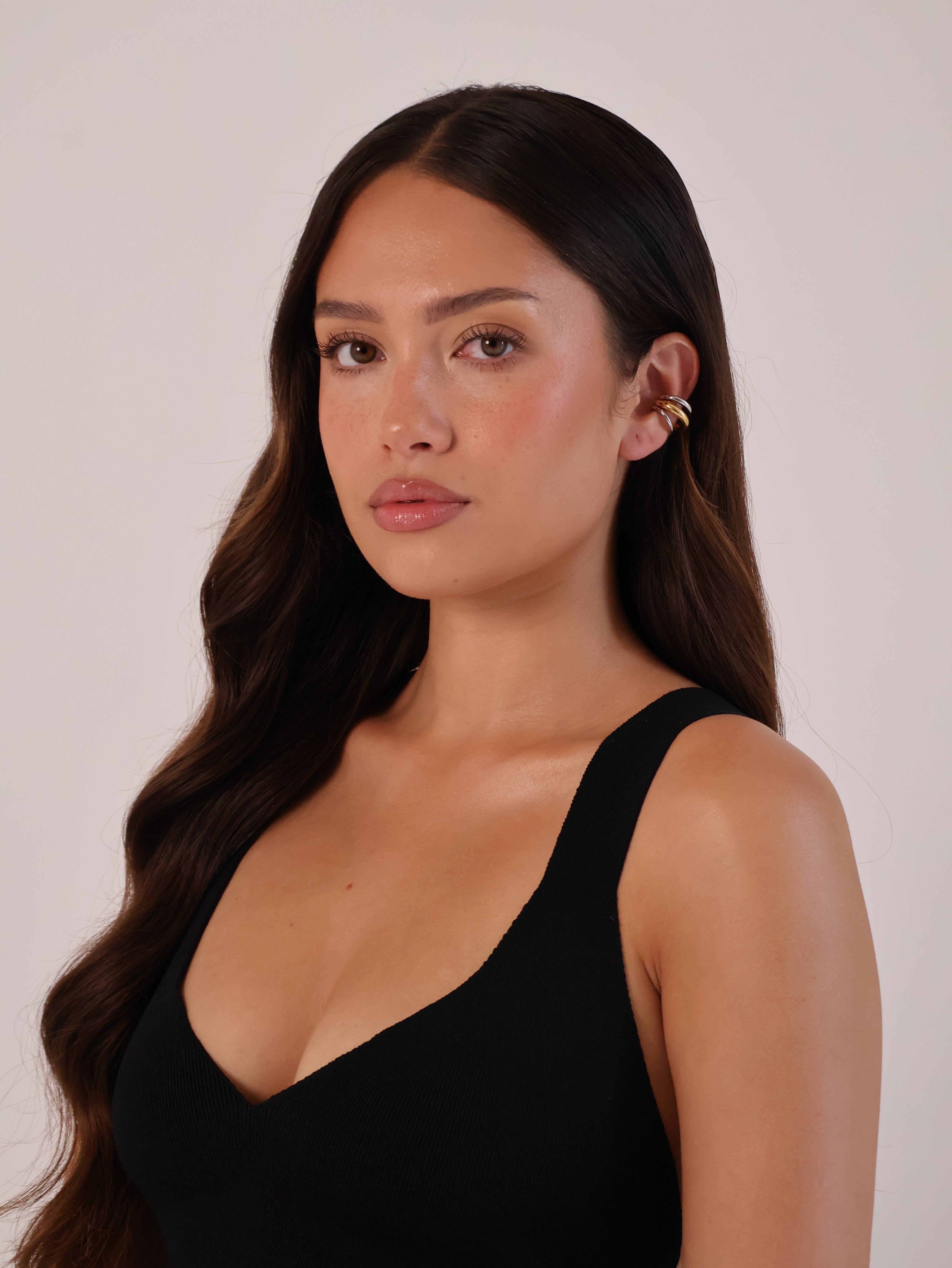 The trio mixed cuff features a mix of gold and silver cuff earrings bound together to create a bold cuff look.