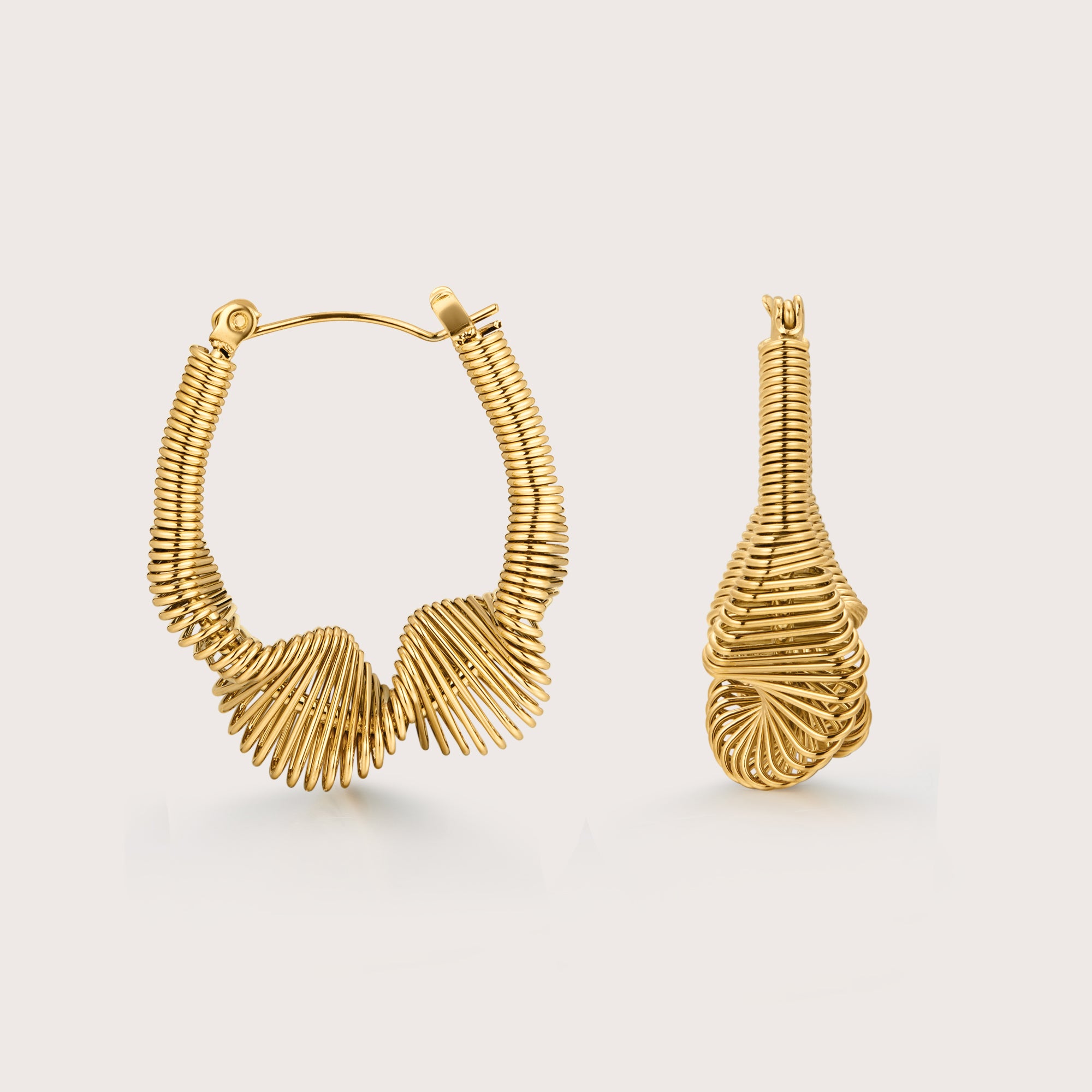 The spring twist earrings features a spring like design and a twist at the bottom of the hoop.