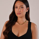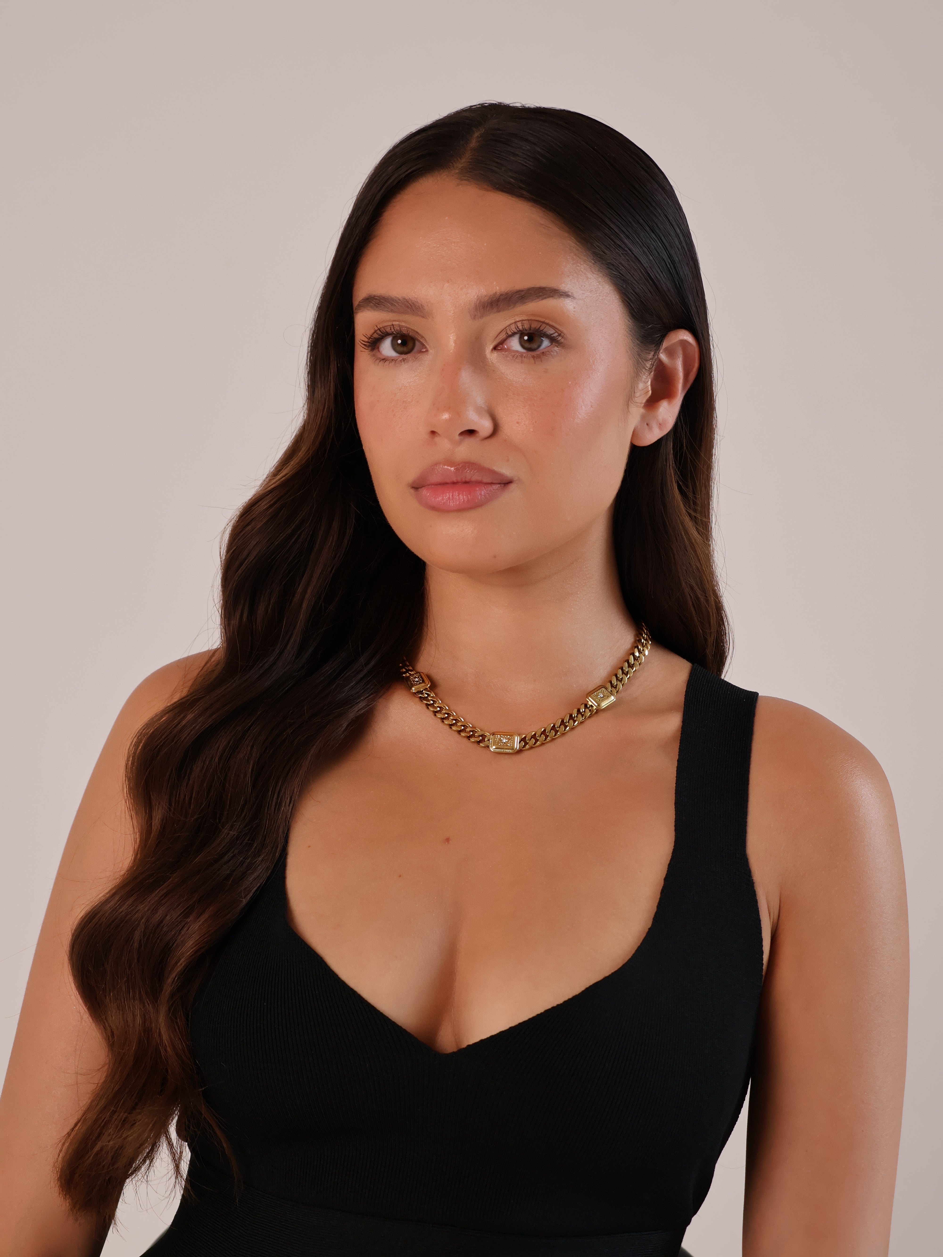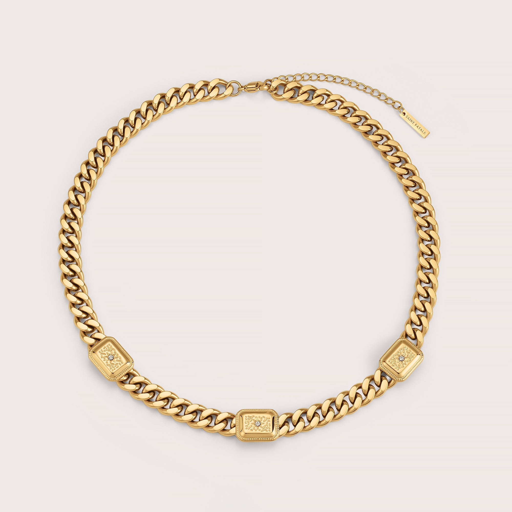 The star trio necklace features three plaques with a star engraving and gem placed on a chunky link chain.