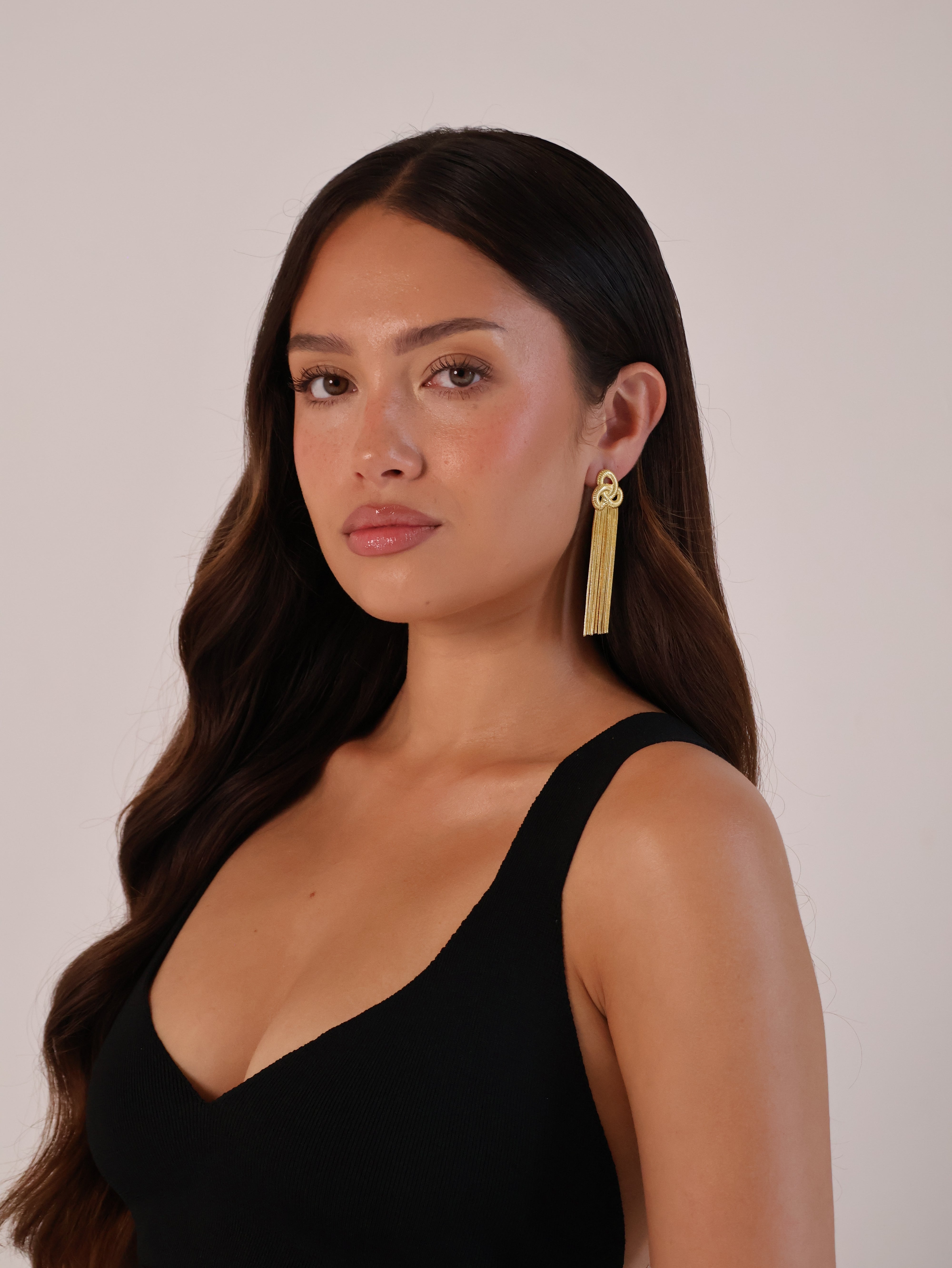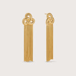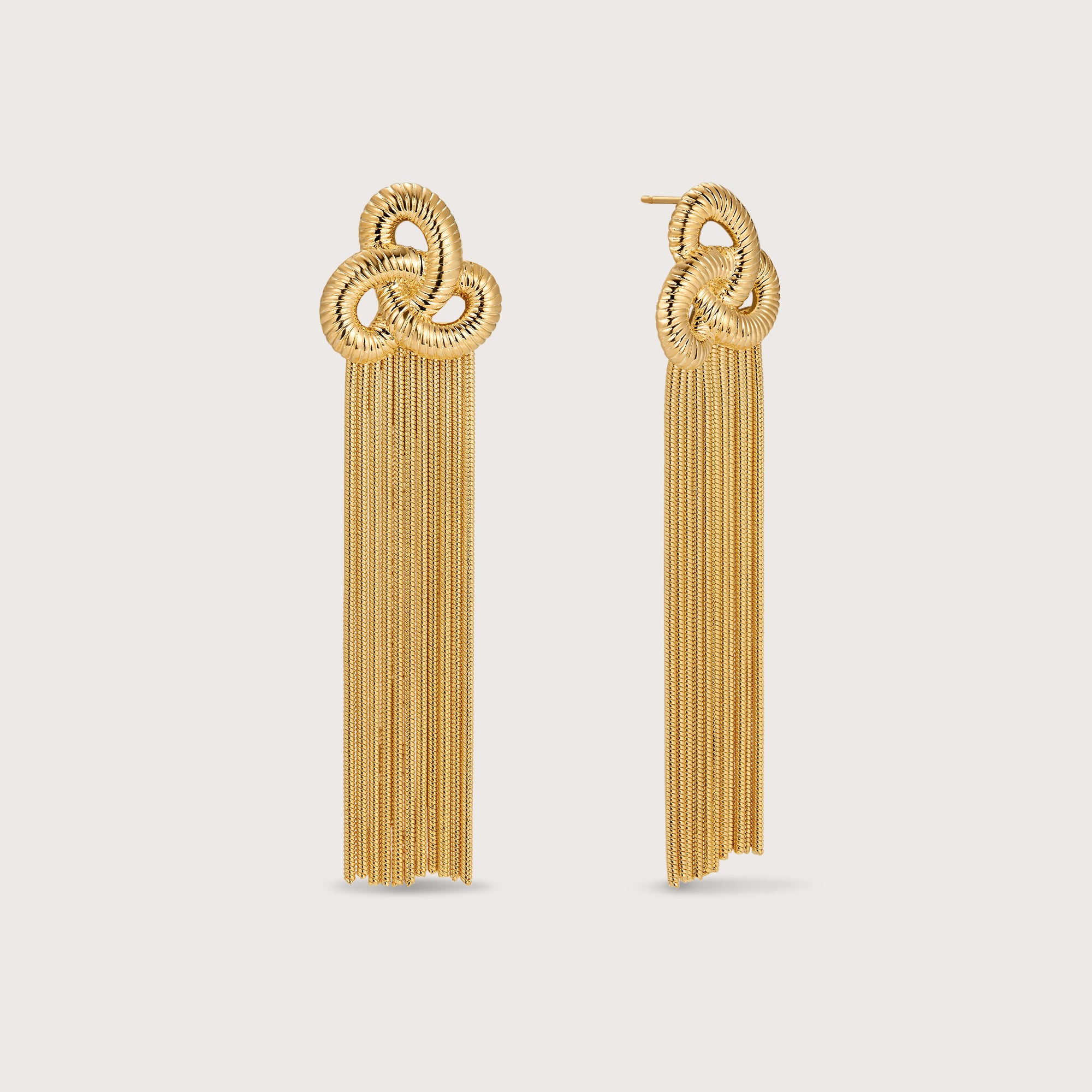 The trio drop earrings feature beautiful long dangling chains and a woven trio of circles.