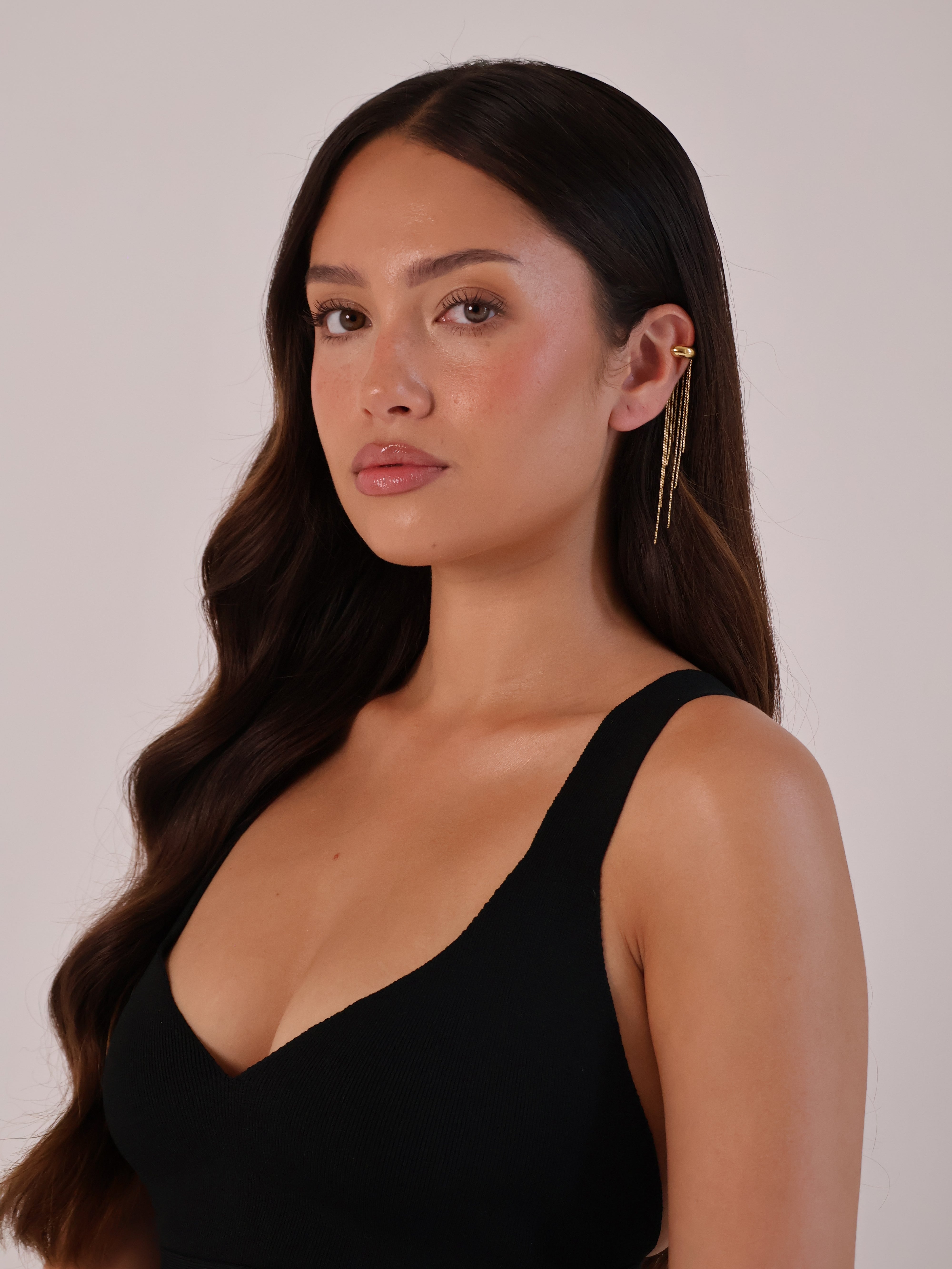 An elegant and bold addition to your look - the waterfall single cuff features a waterfall like set of chains bound to a bold cuff.