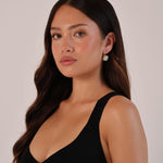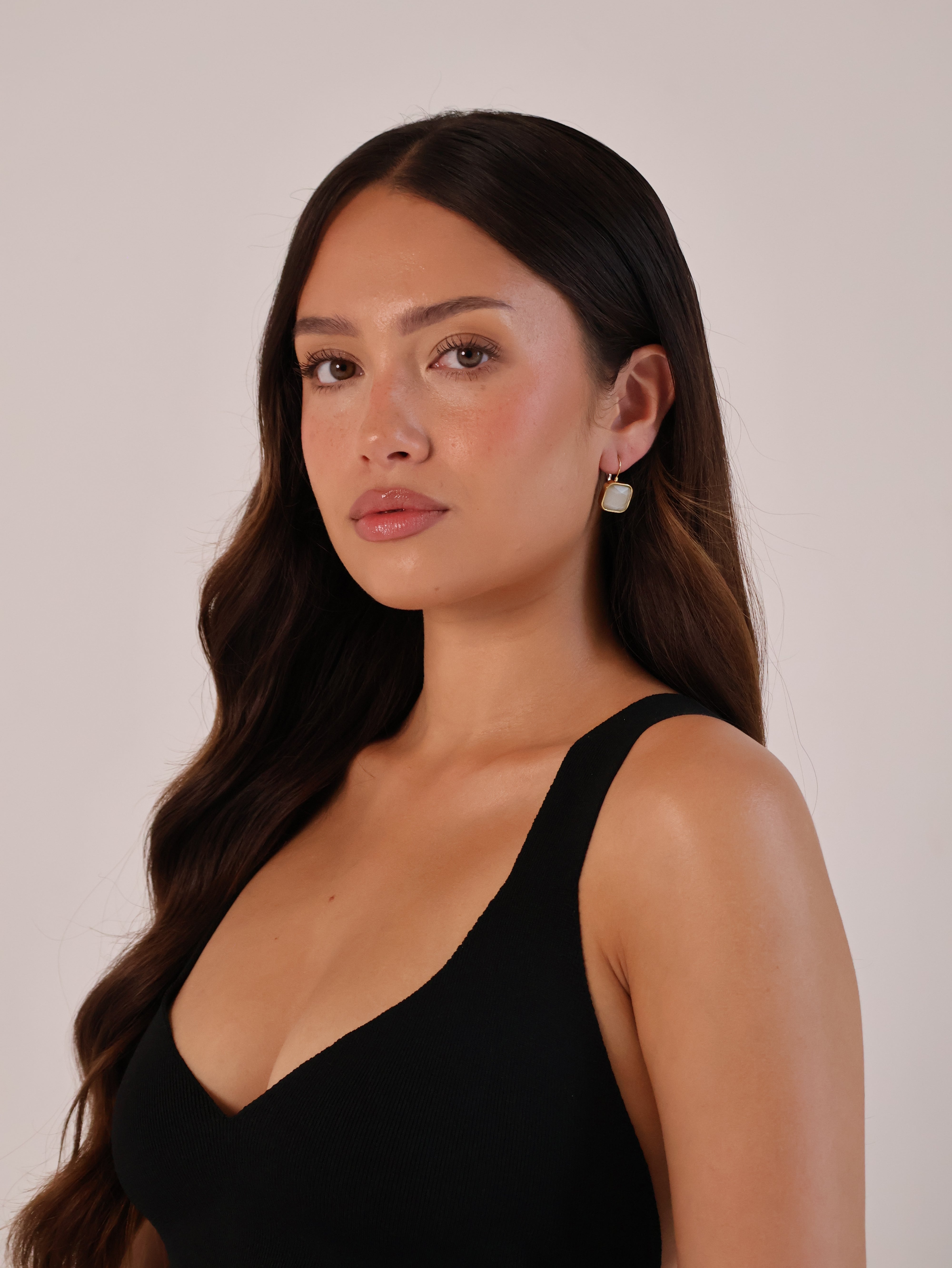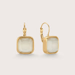 The square drop earrings are a classic and timeless pair of earrings that are great for daily wear. They feature a white stone encased in gold.