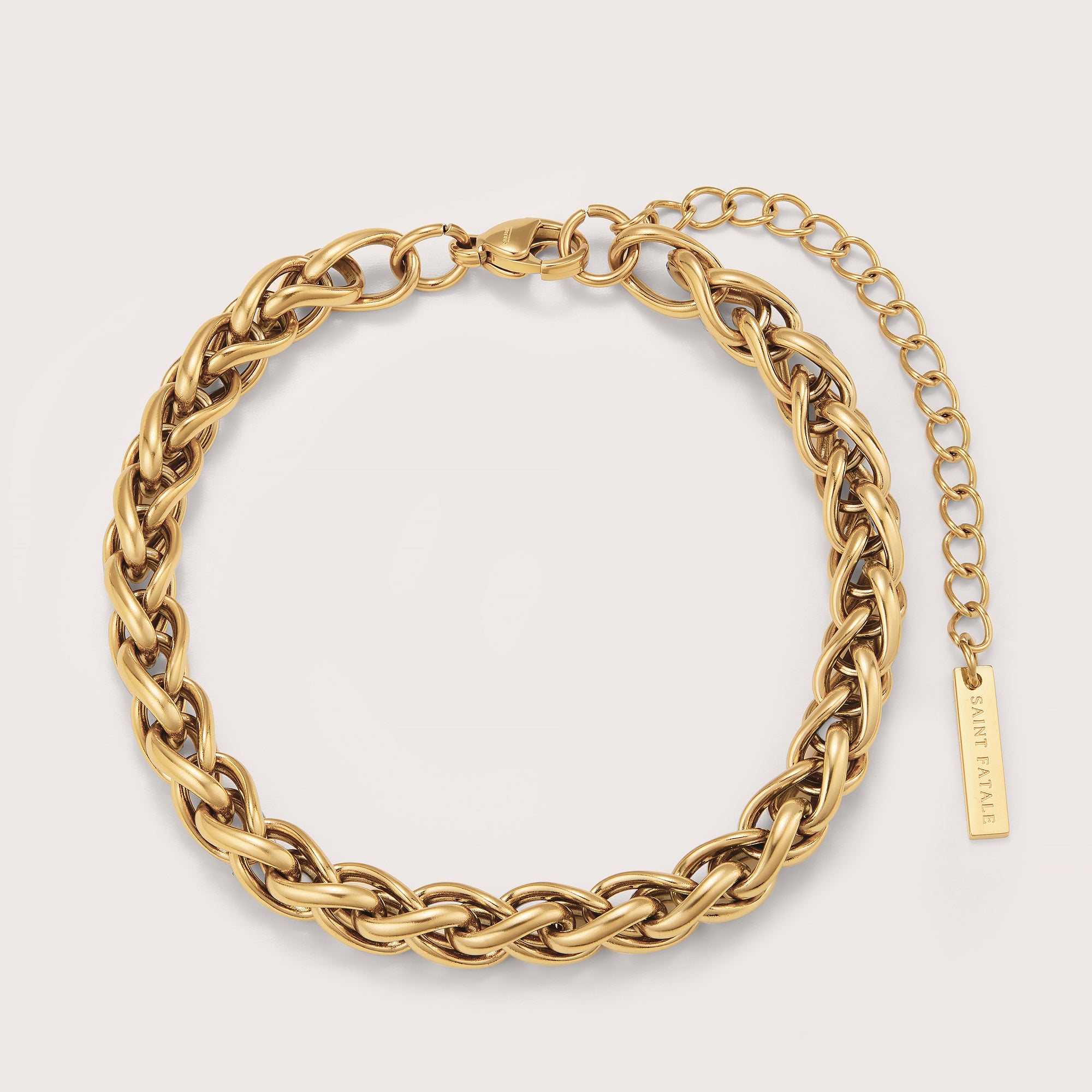 The woven bracelet features an intricately woven chain pattern.